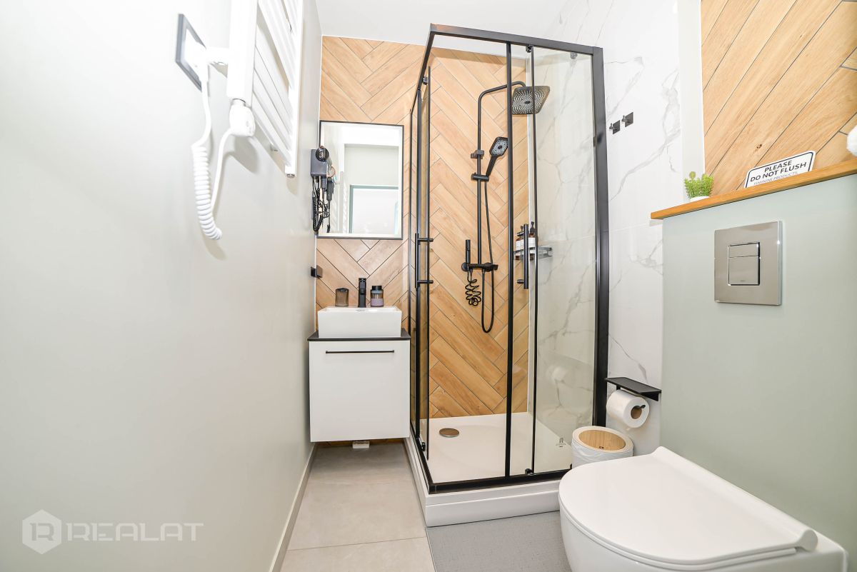 Modern bathroom with shower, towels, and a hairdryer;