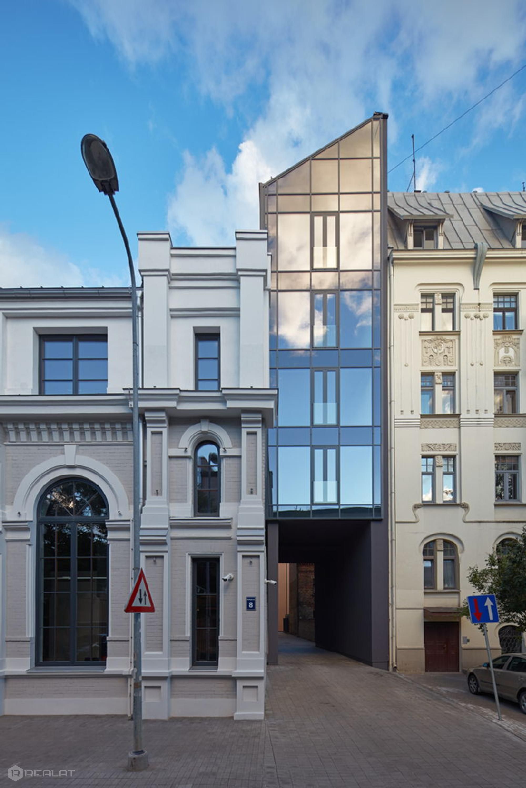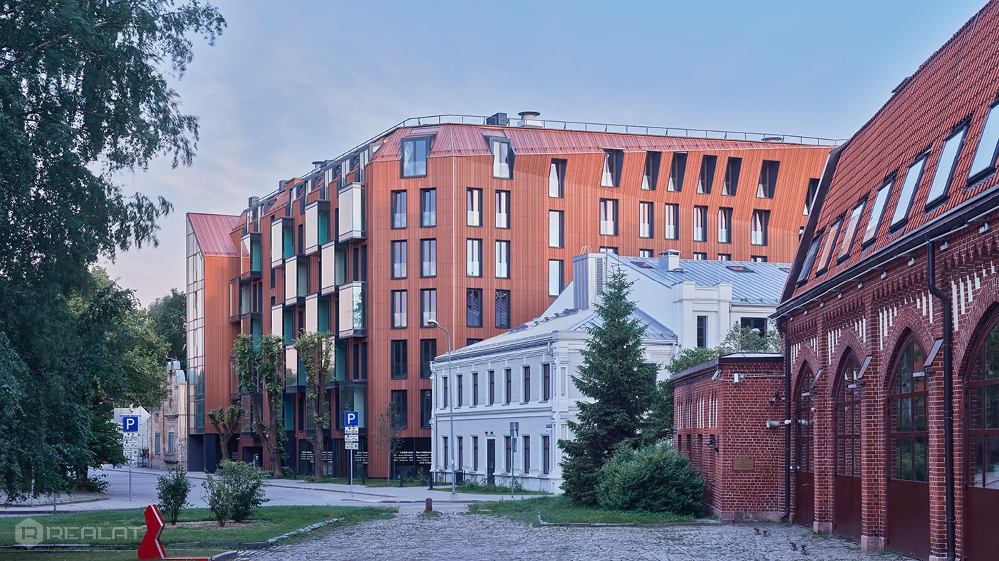 The Lofts & Rosegold project is located in a landscaped area of 3955 square meters. The project consists of a new 7-storey apartment building and a four-storey building of an architectural monument, combined with a glass gallery.