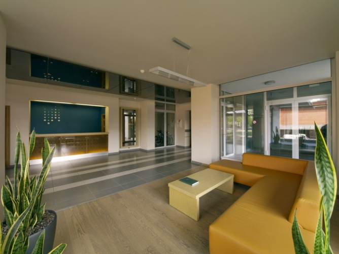 The buildings’ lobbies are fitted with furniture making them cosy for meeting your guests; there are high-speed elevators, underground and overground car parks, a sauna and a training room, rooms for storing baby carriages and bicycles. For the security of the occupants, CCTV is in use.