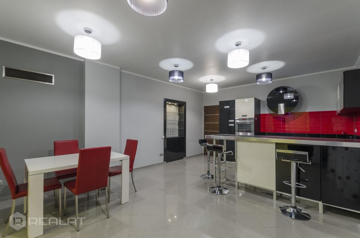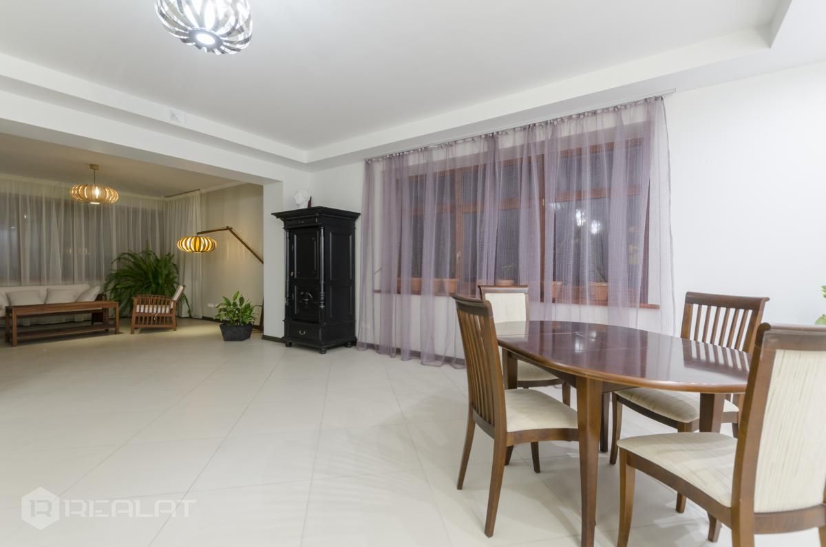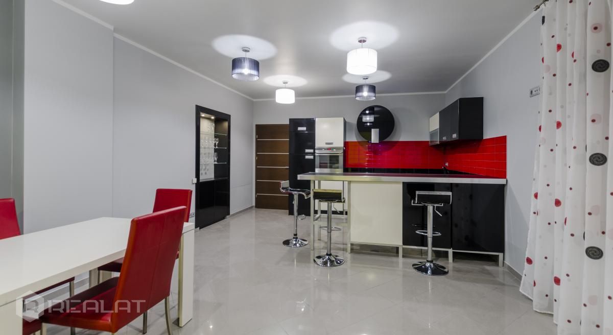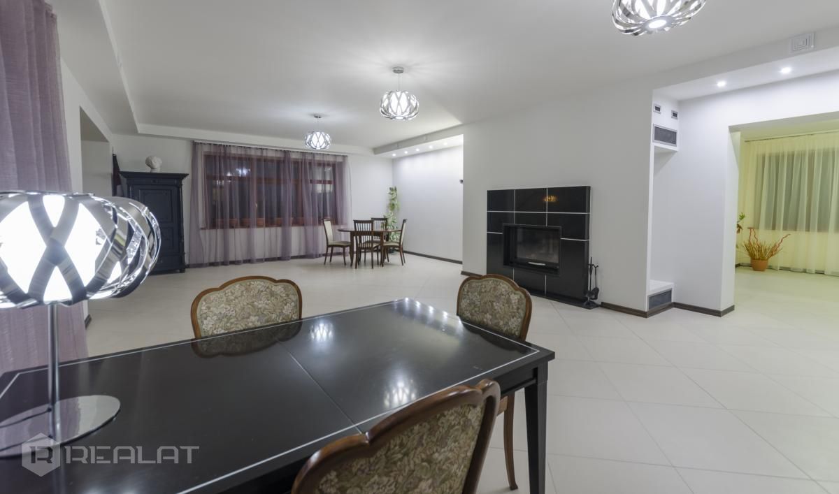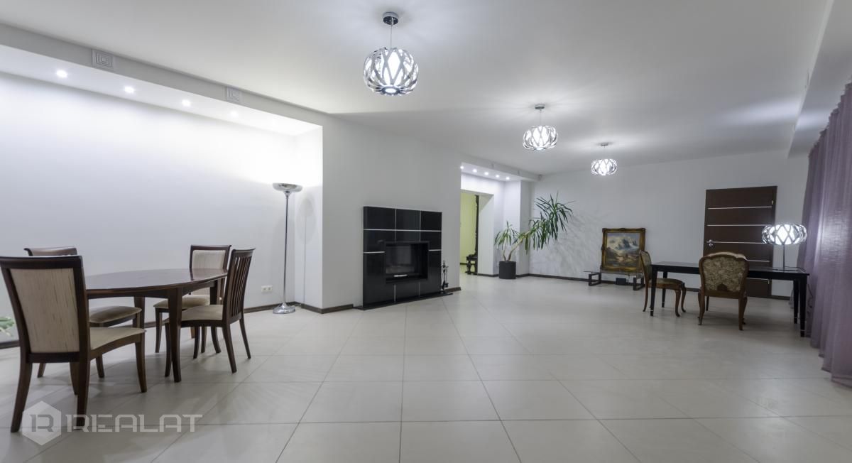 Ērtības - Mēbelēts, Garderobe, Vanna, Duša, Kamīns, Gāzes apkure, Autostāvvieta. Garāža, Jumta terase.