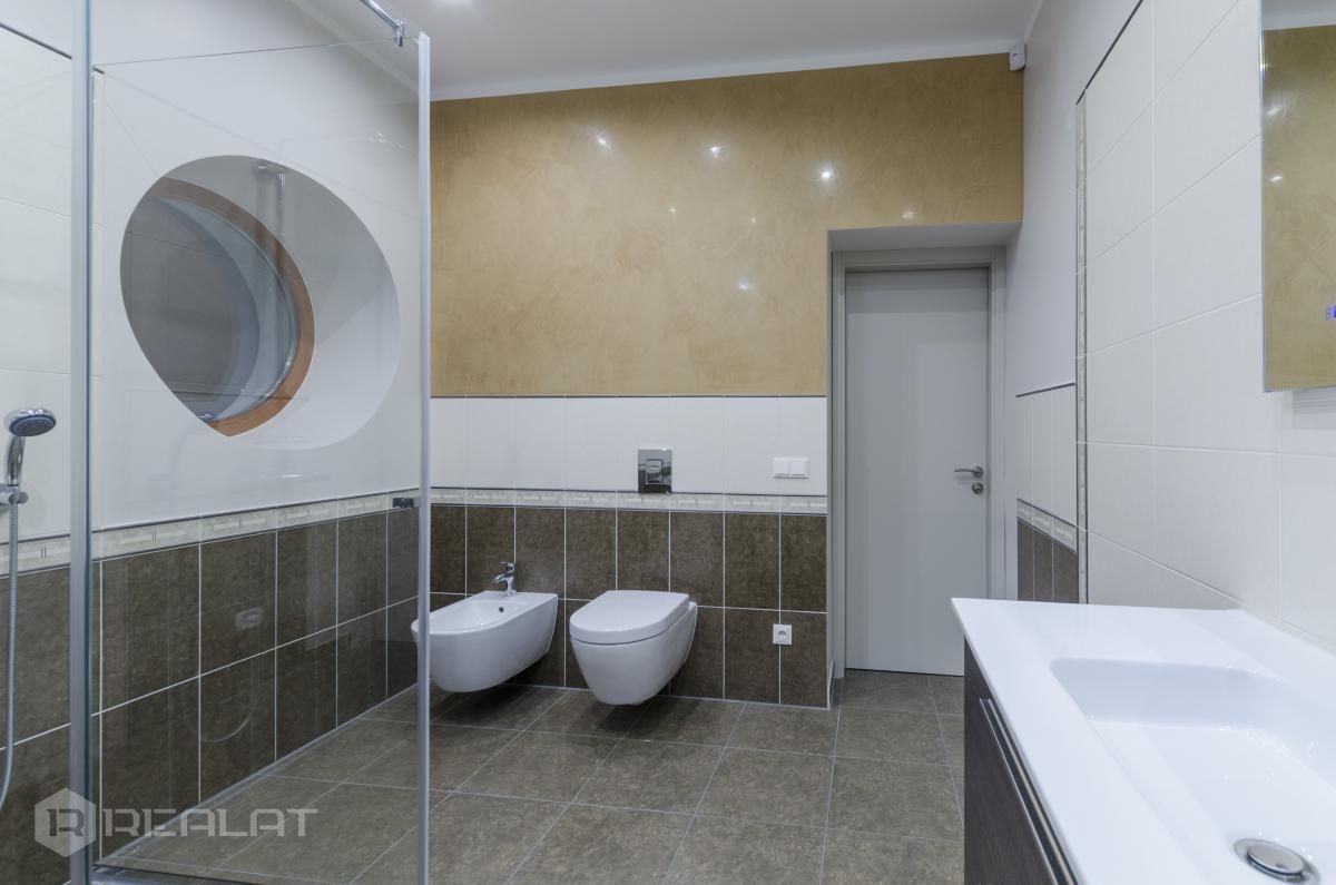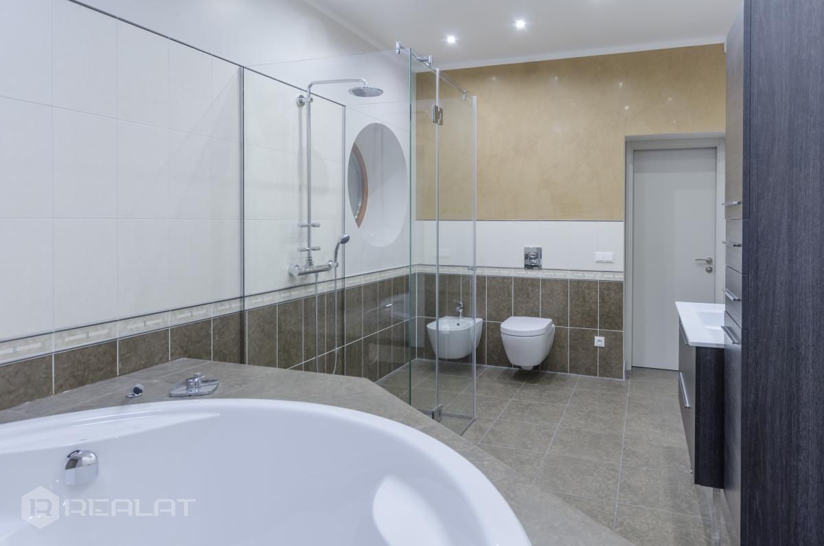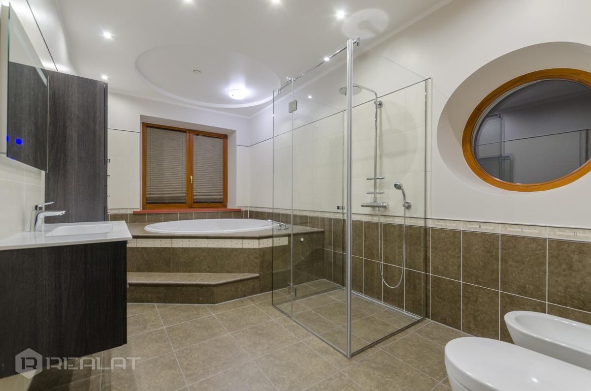 Sanitārais mezgls - trīs sanmezgli, vanna, džakuzi, divi bidē, duškabīne, jauna santehnika.