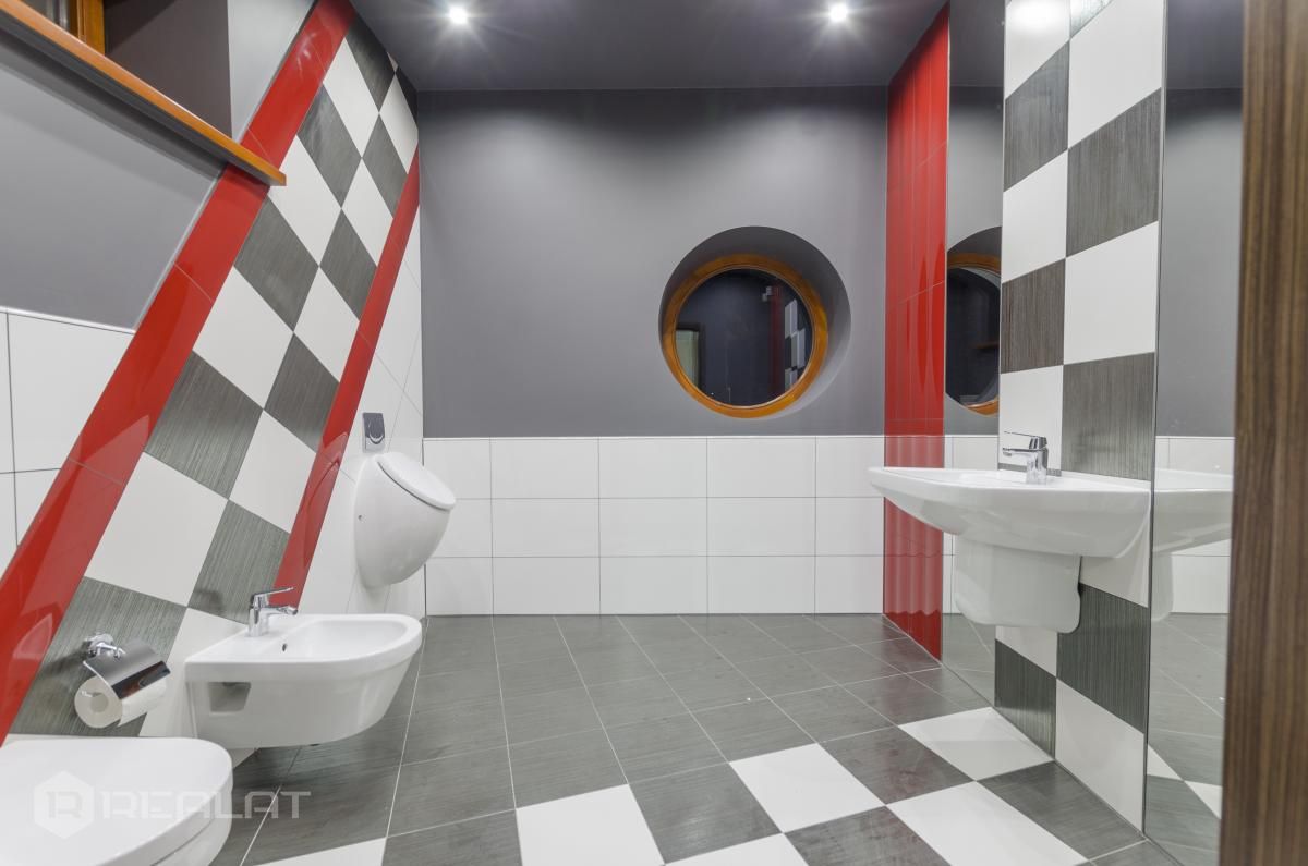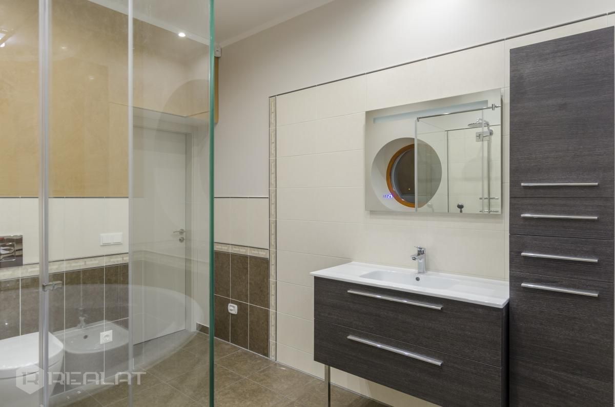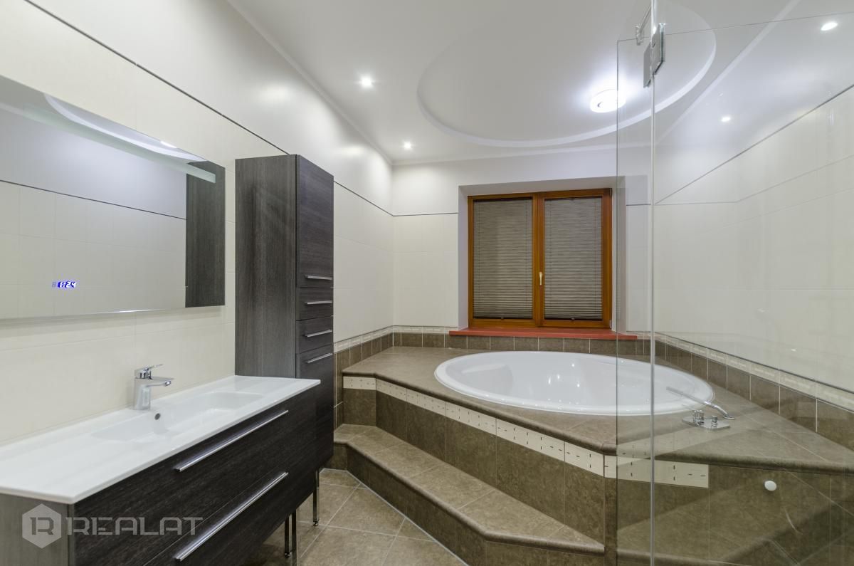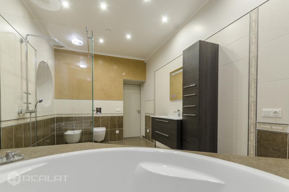 Sanitārais mezgls - trīs sanmezgli, vanna, džakuzi, divi bidē, duškabīne, jauna santehnika.