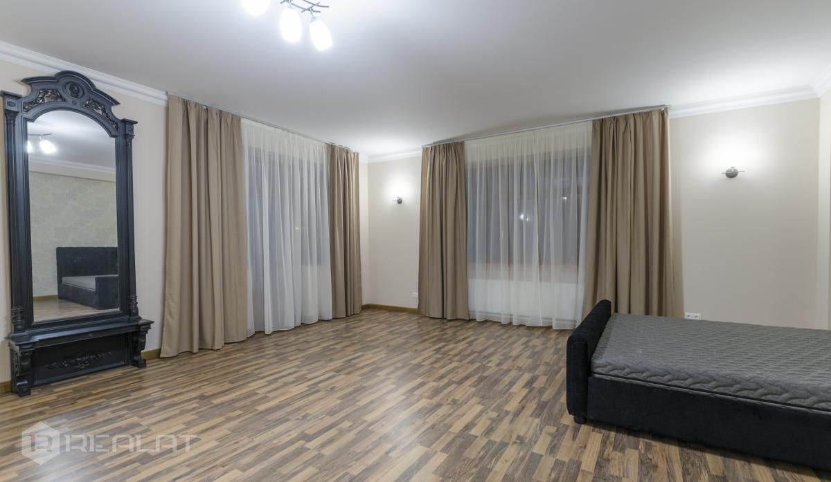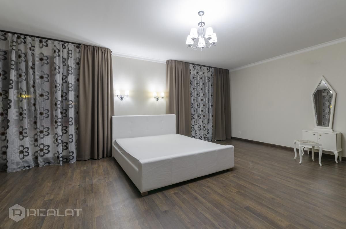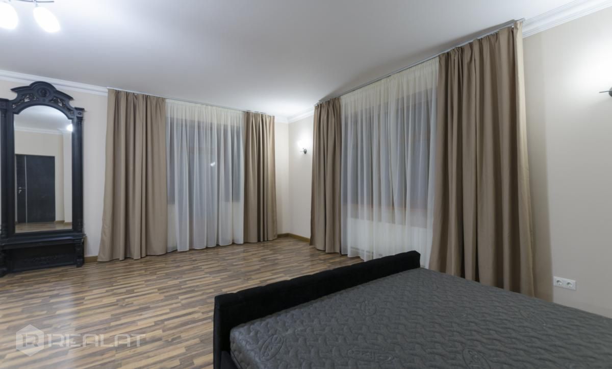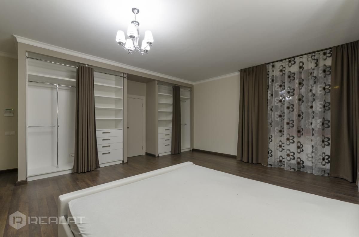 Mēbeles - mēbelēts, jaunas mēbeles, ekskluzīvas mēbeles, iebūvēta virtuve, iebūvēti sienas skapji, guļamistabas interjers, divguļamā gulta, dīvāns, gulta, skapis, galds, krēsli.