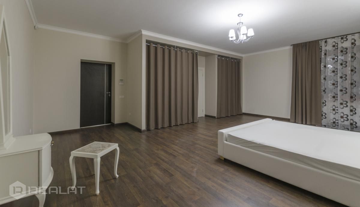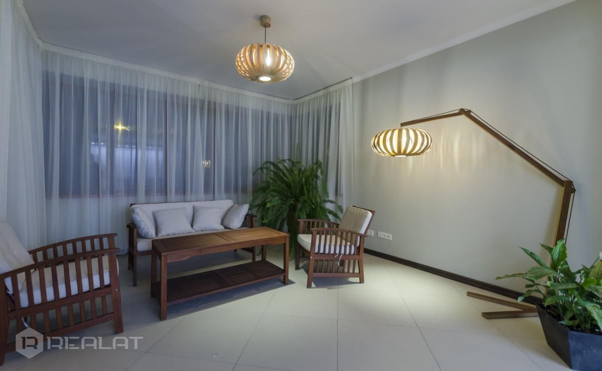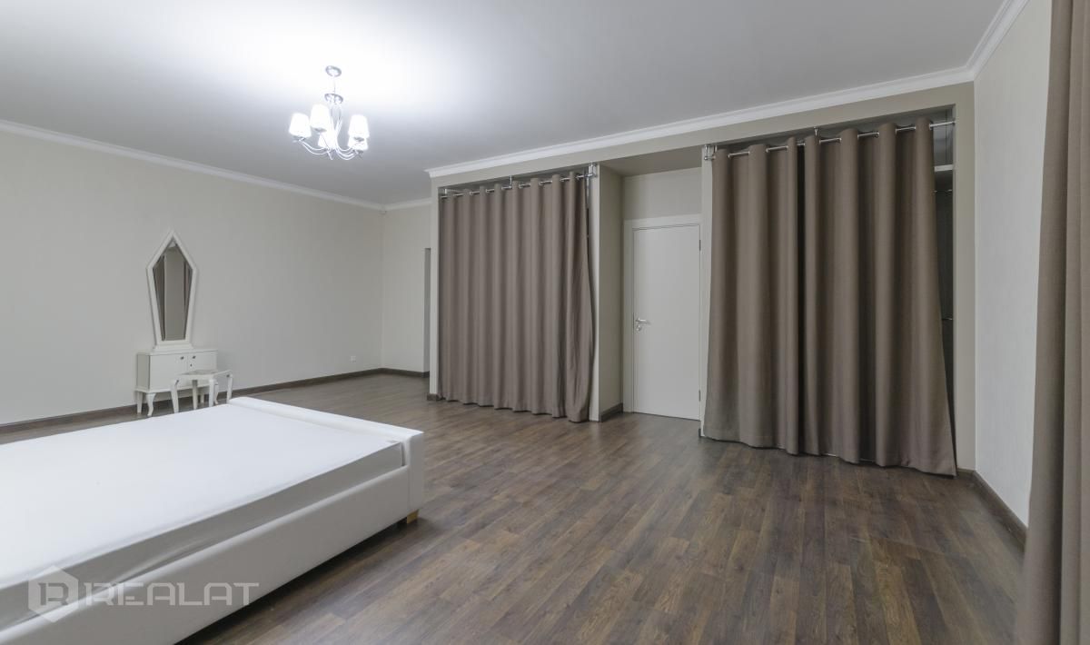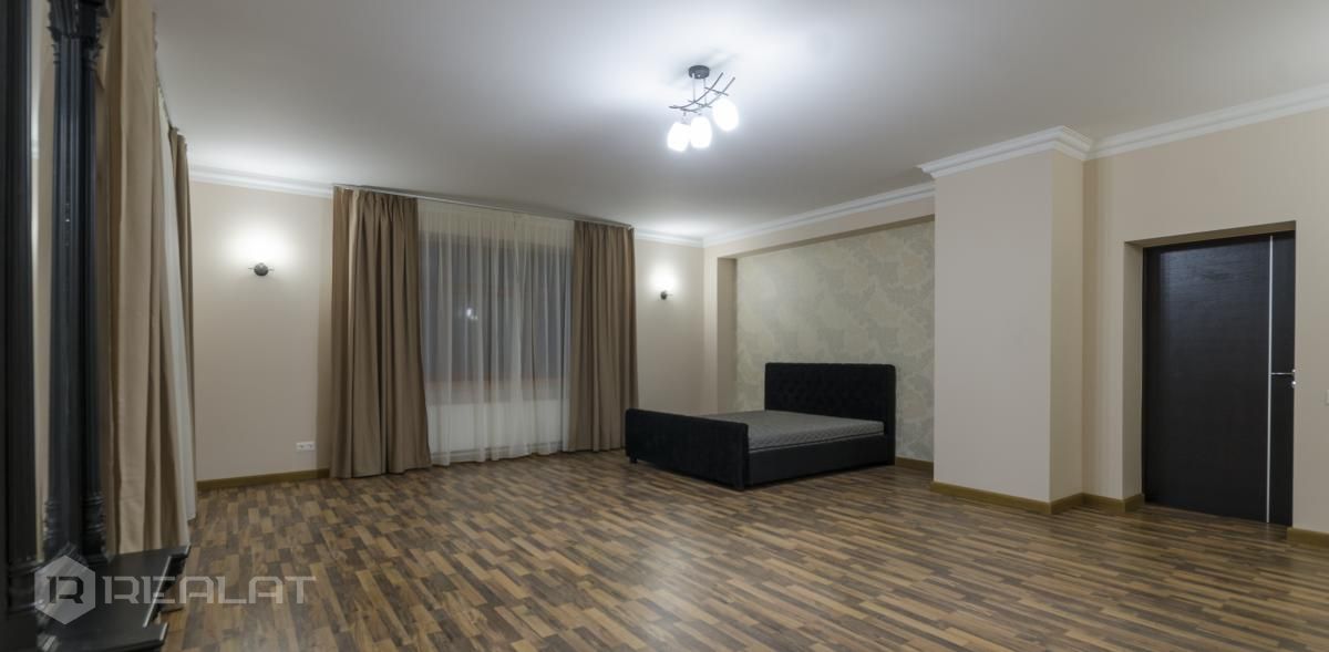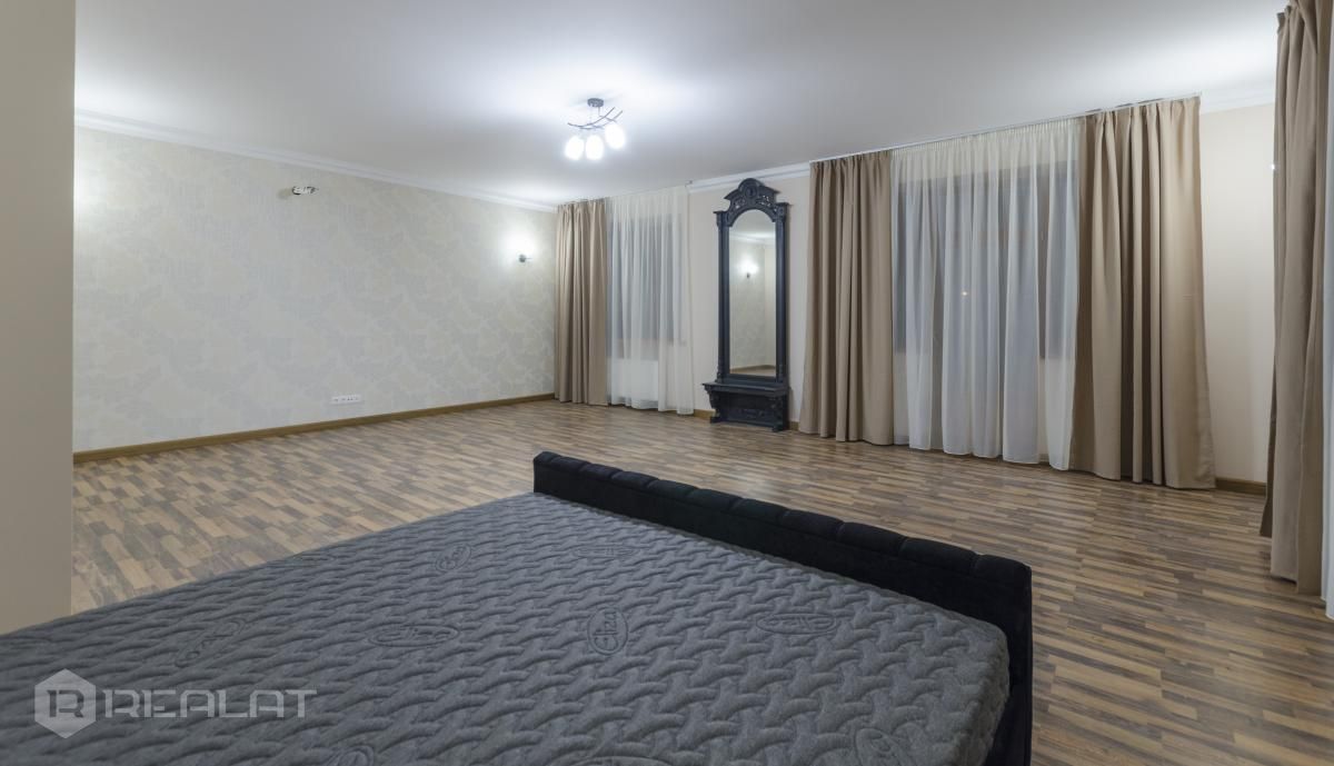 Mēbeles - mēbelēts, jaunas mēbeles, ekskluzīvas mēbeles, iebūvēta virtuve, iebūvēti sienas skapji, guļamistabas interjers, divguļamā gulta, dīvāns, gulta, skapis, galds, krēsli.