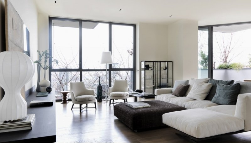 Dzīvokļu grīdas klās 3 slāņu dabīgā koka parkets, griestu augstums 3m, krāsotas dubultās ģipškartona sienas, pelēki balināta ozola finierētas durvis, dizaina augstie vertikālie radiatori, alumīnija grafīta panorāmas logi, santehnika-LAUFEN, DURAVIT, akmens masas vannas un flīzes koka vai marmora tekstūrā salikumā ar lakoniskiem tumši pelēkajiem.