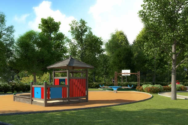 Teritorija būs labiekārtota – asfaltēti un bruģēti ceļi, vairākas atpūtas vietas, apstādījumu grupas ar dažādiem dekoratīvajiem augiem un kokiem, apgaismojums, velosipēdu novietne, no stāvlaukuma norobežots bērnu rotaļu laukums, tai skaitā – basketbola grozs.