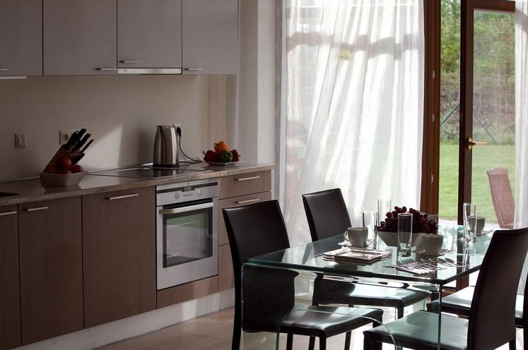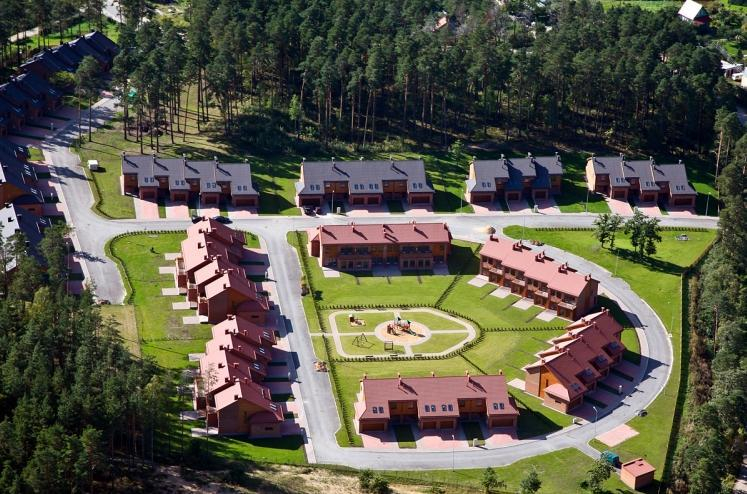 Apogus veido 14 mājas, ar 3 līdz 5 dzīvokļiem katrā no tām. Viena mājokļa platība ir 180 – 200 kv.m. Katram mājoklim ir sava garāža, savs piemājas zemes laukumiņš vidēji 500 kv.m. platībā. Ikviena dzīvokļa otrajā stāvā ir trīs guļamistabas, bet pirmajā veidots atvērts plānojums - dzīvojamā istaba un virtuves zona ar izeju uz āra terasi. Tas ir optimāls un maksimāli ērts risinājums gan ģimenēm ar bērniem, gan arī aktīviem darījumu cilvēkiem. Ikvienā mājoklī ir divas vannas istabas – viena augšējā stāvā, otra – pirmā stāva telpās. Visos mājokļos ir iespējams ierīkot kamīnu. Apogos ir padomāts par visu, lai cilvēkam būtu ērti dzīvot. Ciemats ir pilnībā nožogots un apsargāts. Tā teritorija tiek rūpīgi kopta un uzmanīta: tiek gādāts, lai iedzīvotāji bez bažām varētu atstāt uz sev piederošās terases, piemēram, grilu vai atpūtas krēslus un zināt, ka viņu īpašumu saimnieku prombūtnes laikā nekas neapdraudēs. Pilnībā ir ierīkots teritorijas apgaismojums. Gājēju celiņus klāj bruģa segums.