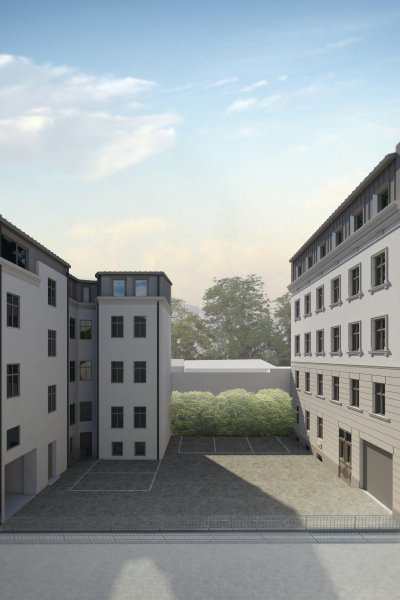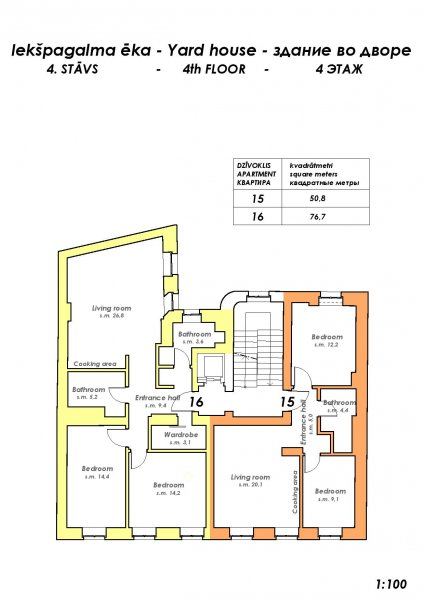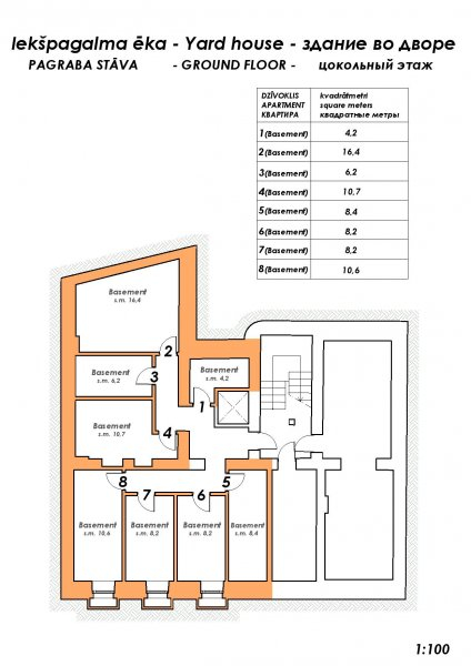 Ēkā, kura izvietota pagalmā arī izvietoti 9 dzīvokļi ar platību no 51m2 līdz 80m2, kā arī pagrabā atrodas glabātuves, ēkā ir arī viena slēgtā garāža ar 22m2 platību. Dzīvokļiem ir racionāli, pārdomāti plānojumi ar studio tipa viesistabām.