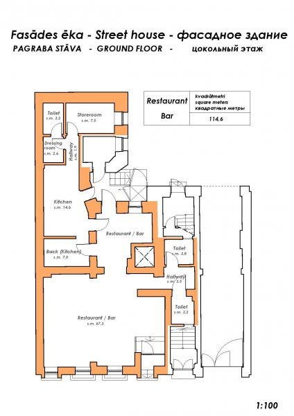 Fasādes mājā ir izvietotas telpas arī komercdarbība ar platību 115m2 – restorānam vai ofisam.
