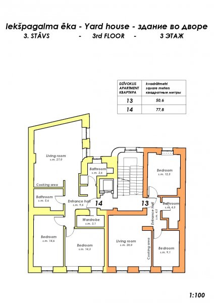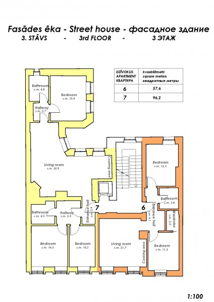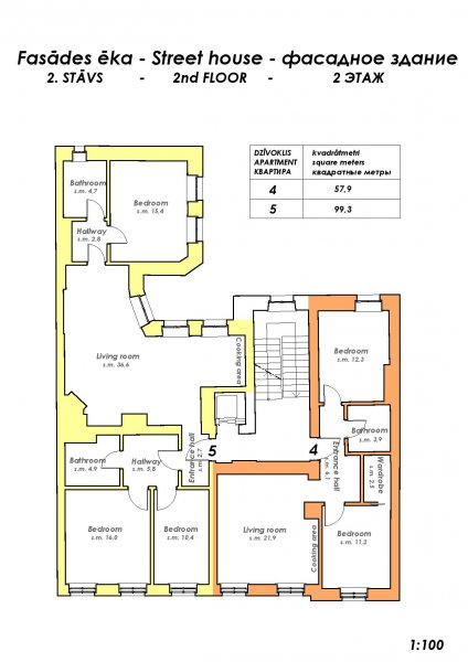 Fasādes ēkā, kura iziet uz ielas pusi, atrodas 9 dzīvokļi ar platību: 37,7m2, kas ir pati nelielākā un 101,5m2 pati lielākā ar istabu skaitu no 2 līdz 4.