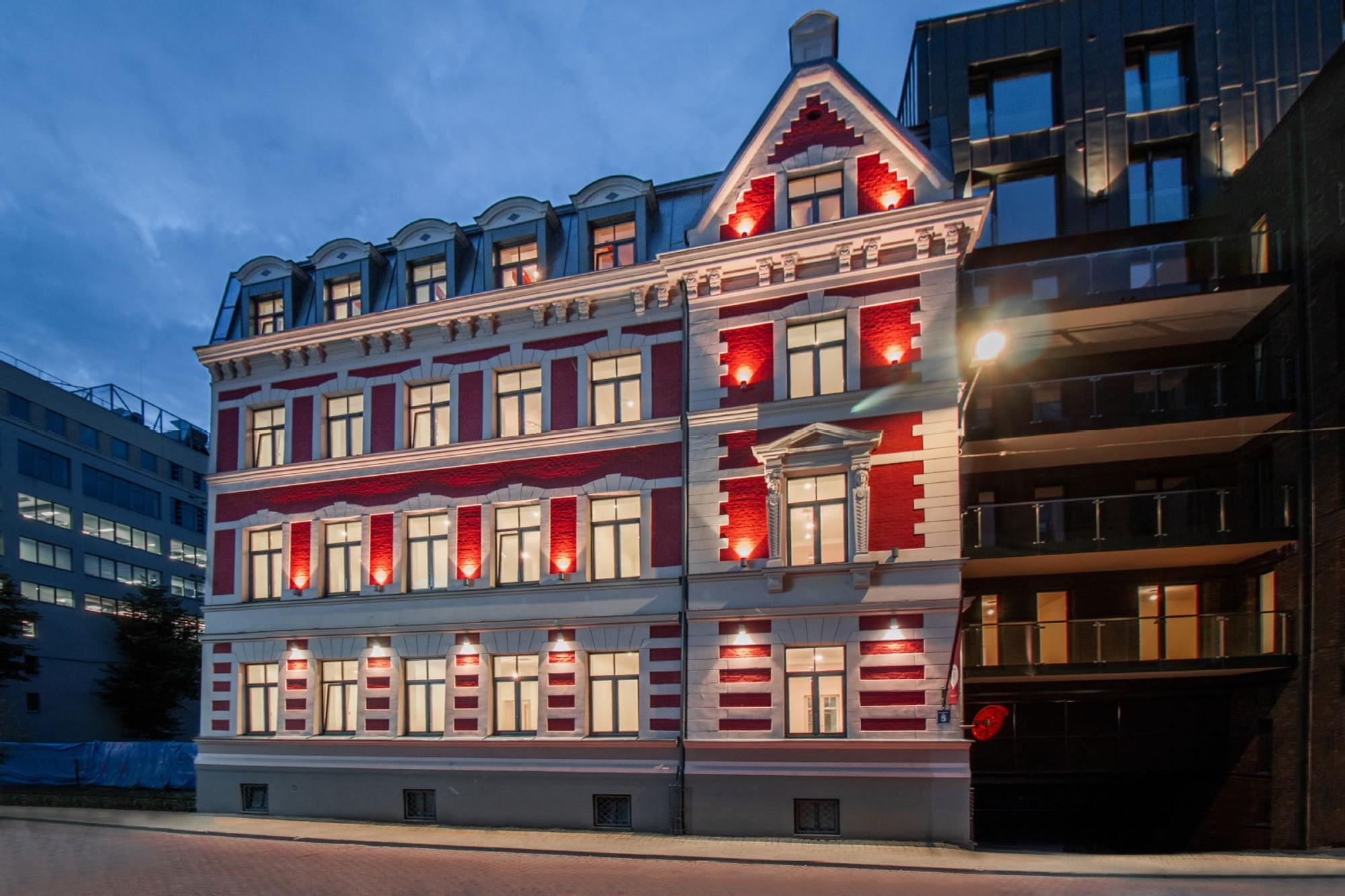 Ēkas fasādē izmantotas Nīderlandē ražotas ķieģeļflīzes un tonēts minerālapmetums.