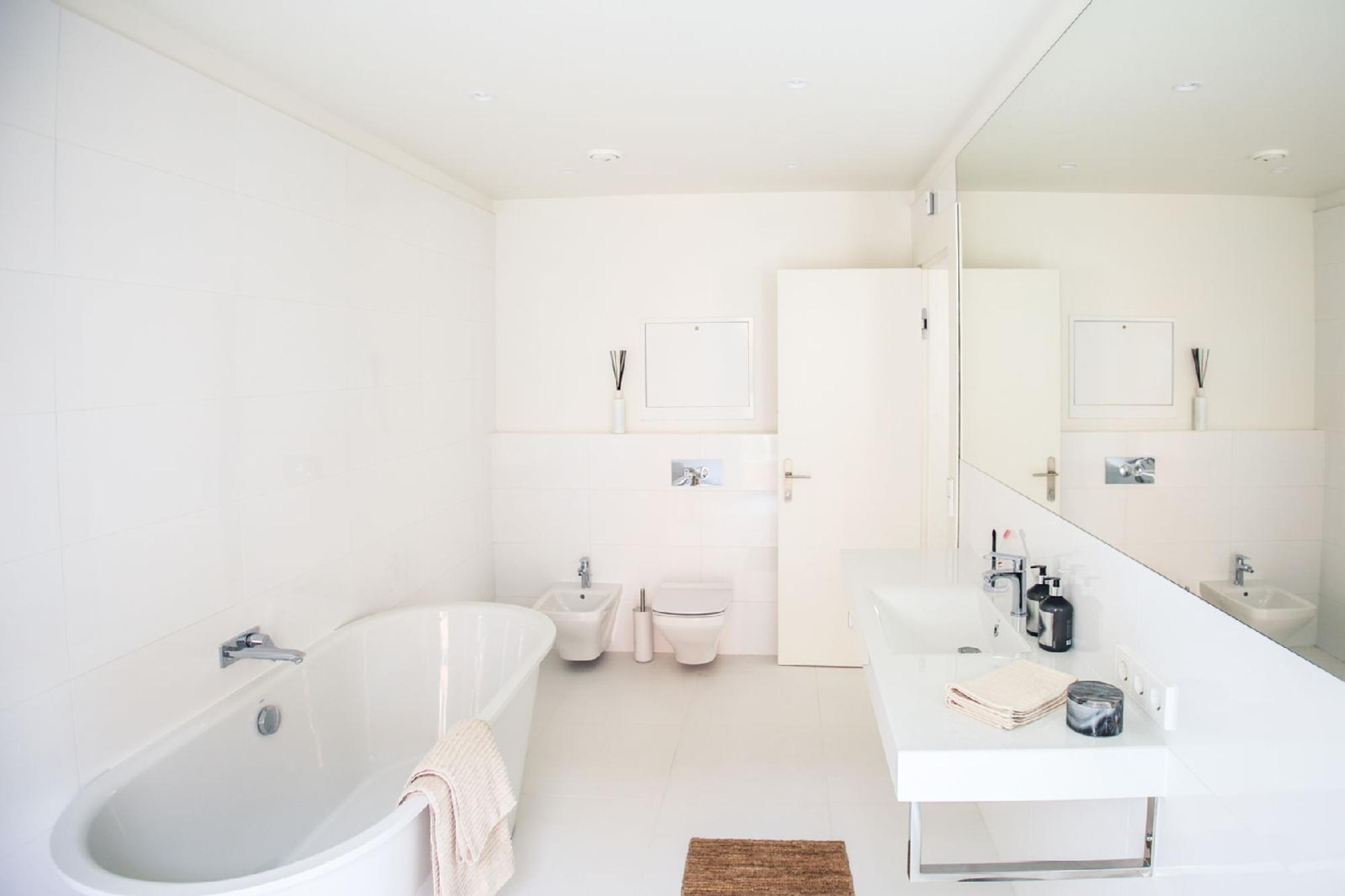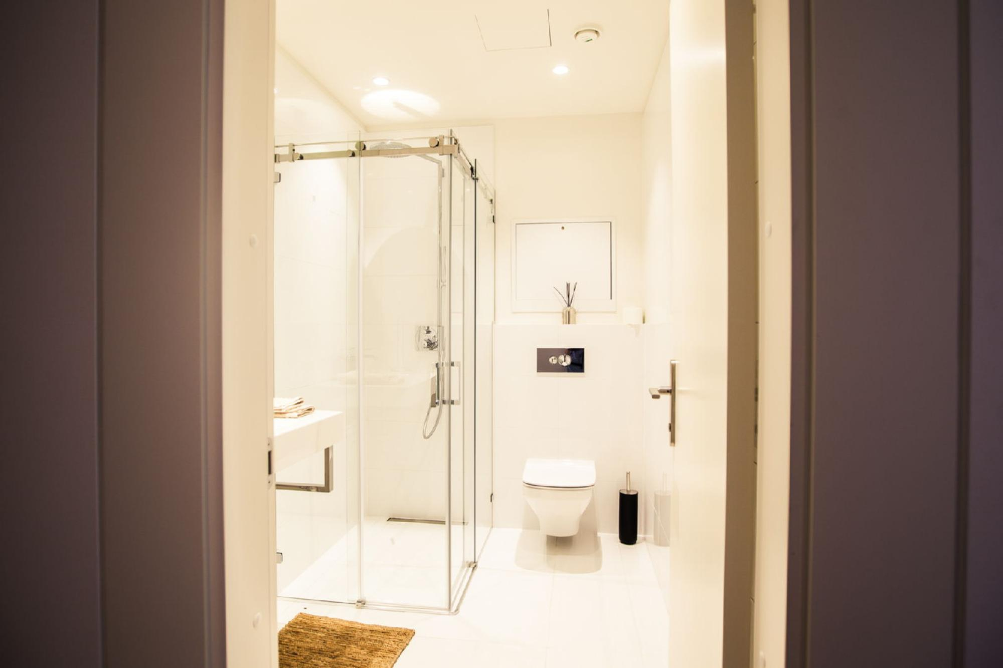 Vannas istabās ir siltās grīdas + DURAVIT un PAA santehnika, HansGrohe ūdens maisītāji.