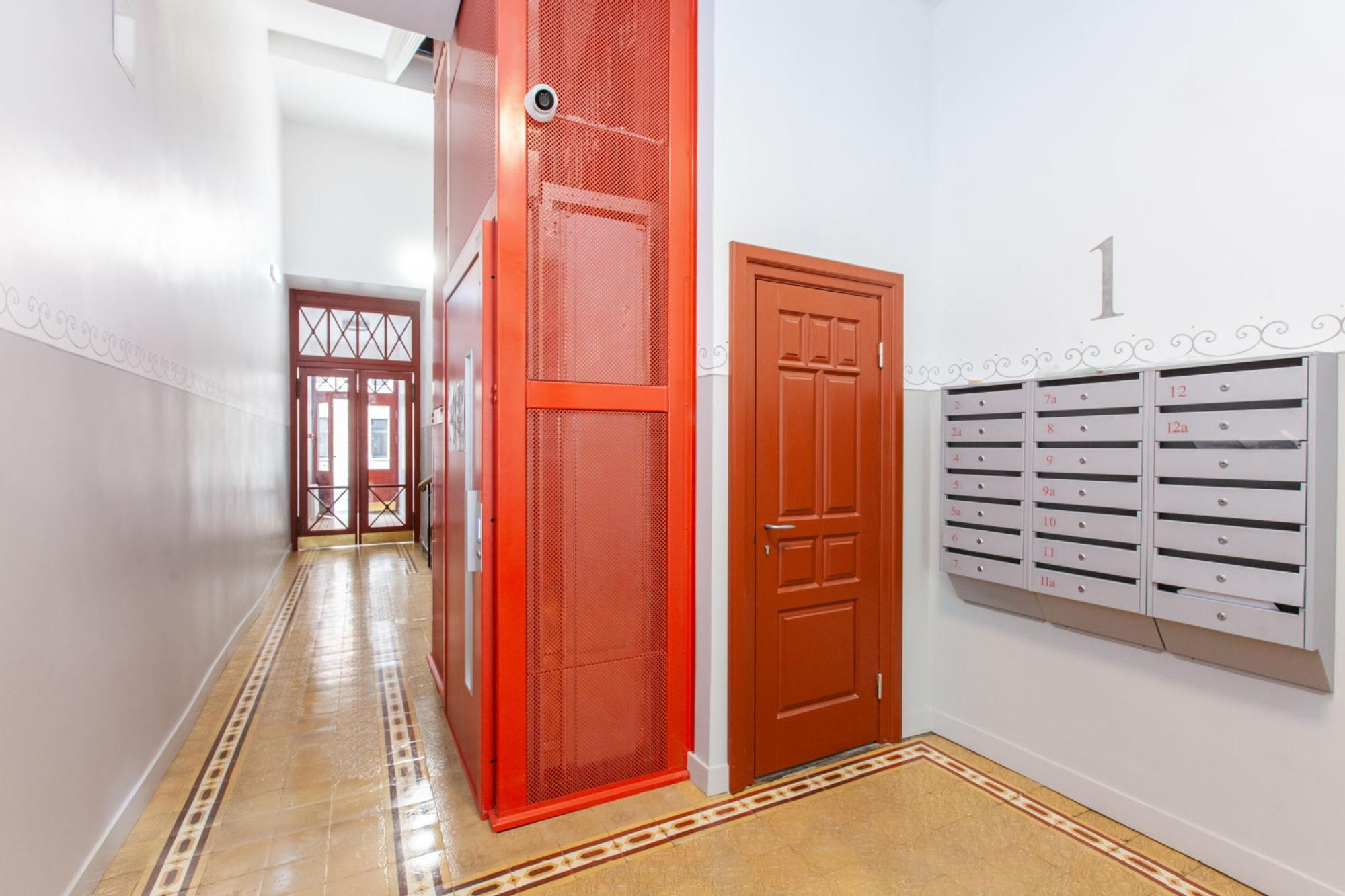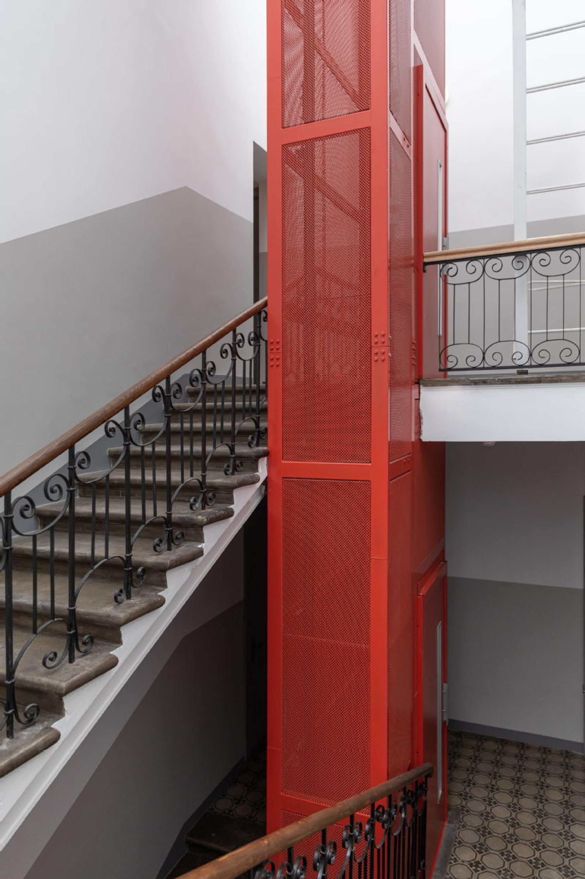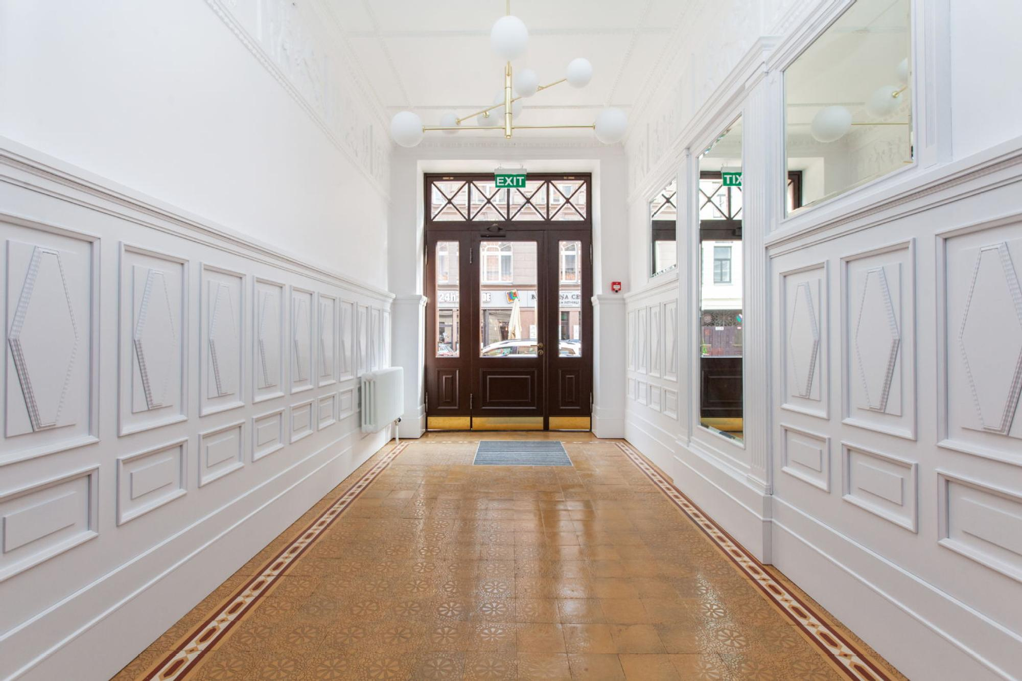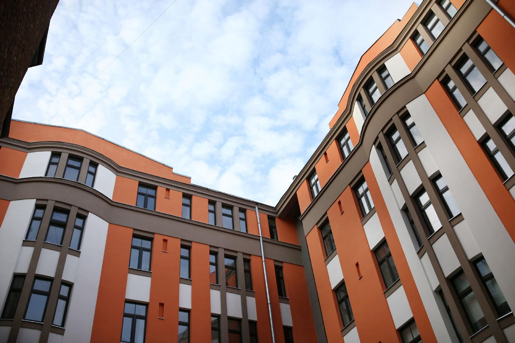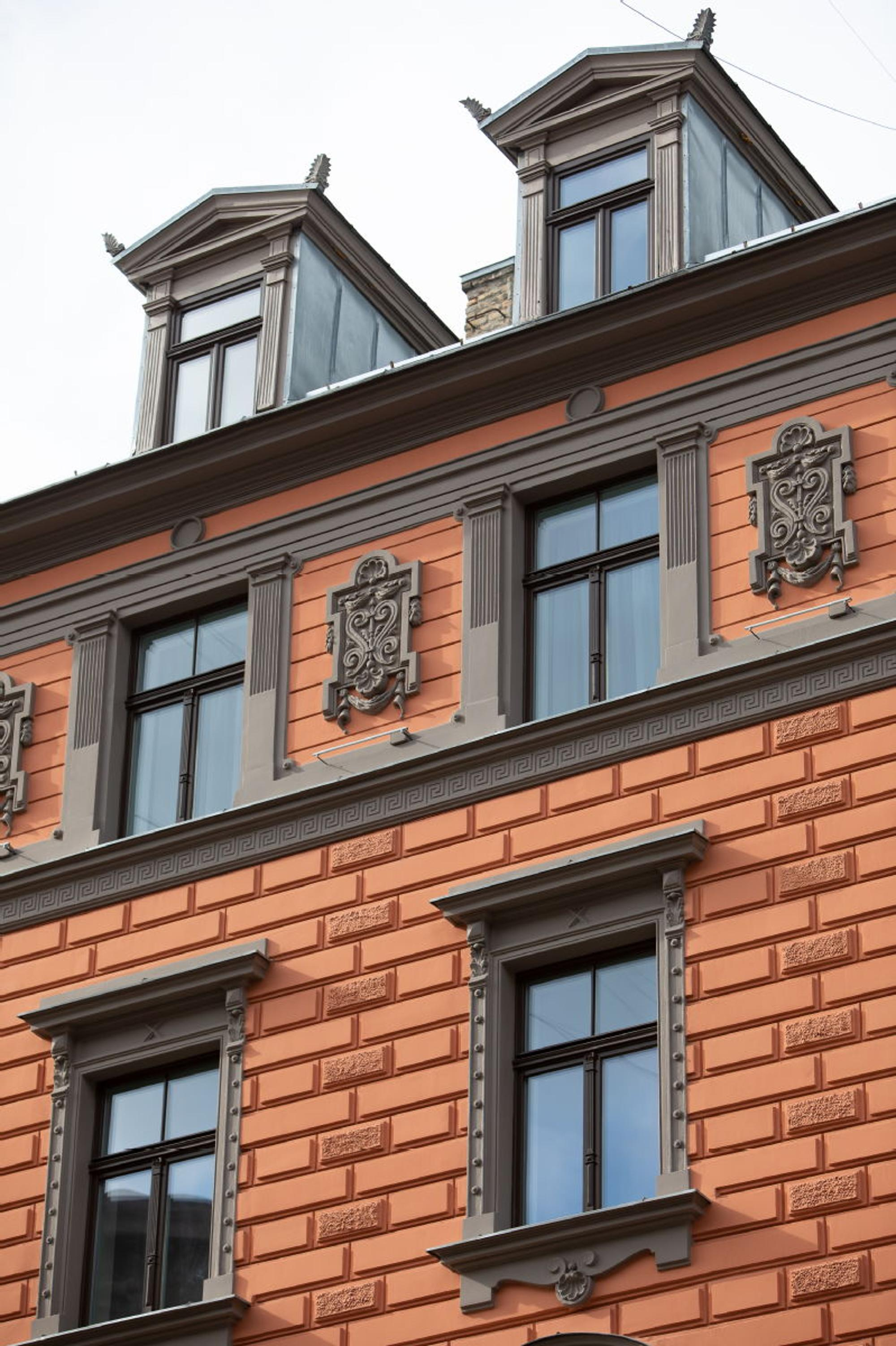 Renovācijas procesā fasādei tika pievienoti koši elementi, lai paplašinātu tās stilistisko diapazonu, piešķirot klasiskajam dizainam mūsdienīgu izskatu.