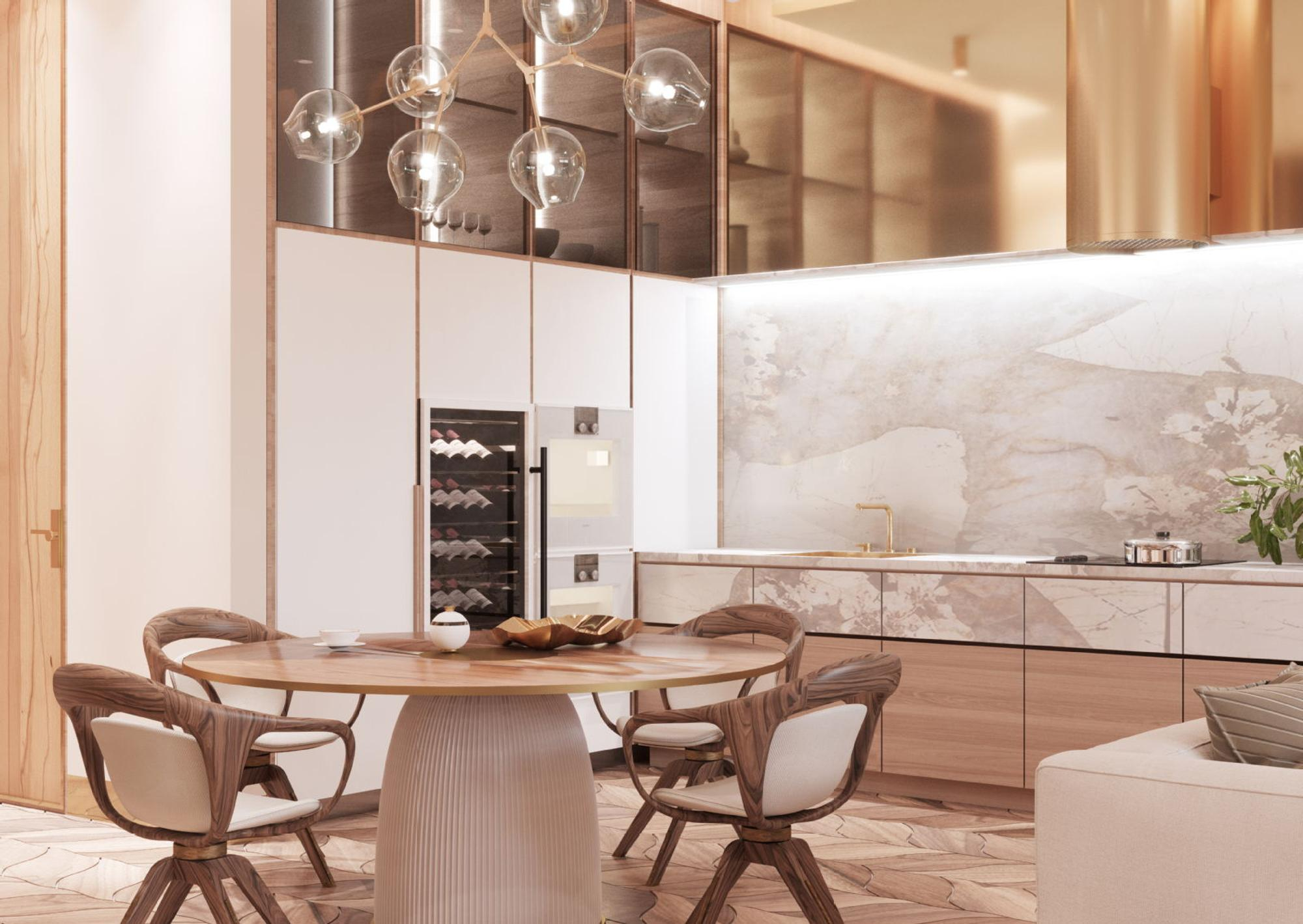 Gaismas avotu daudzveidība, sākot ar efektīgu lustru un līdz pat maigajam sienu un dzīvokļu numuru apgaismojumam padara tajā esošus priekšmetus un detaļās tilpīgas un vizuāli paplašina telpu.