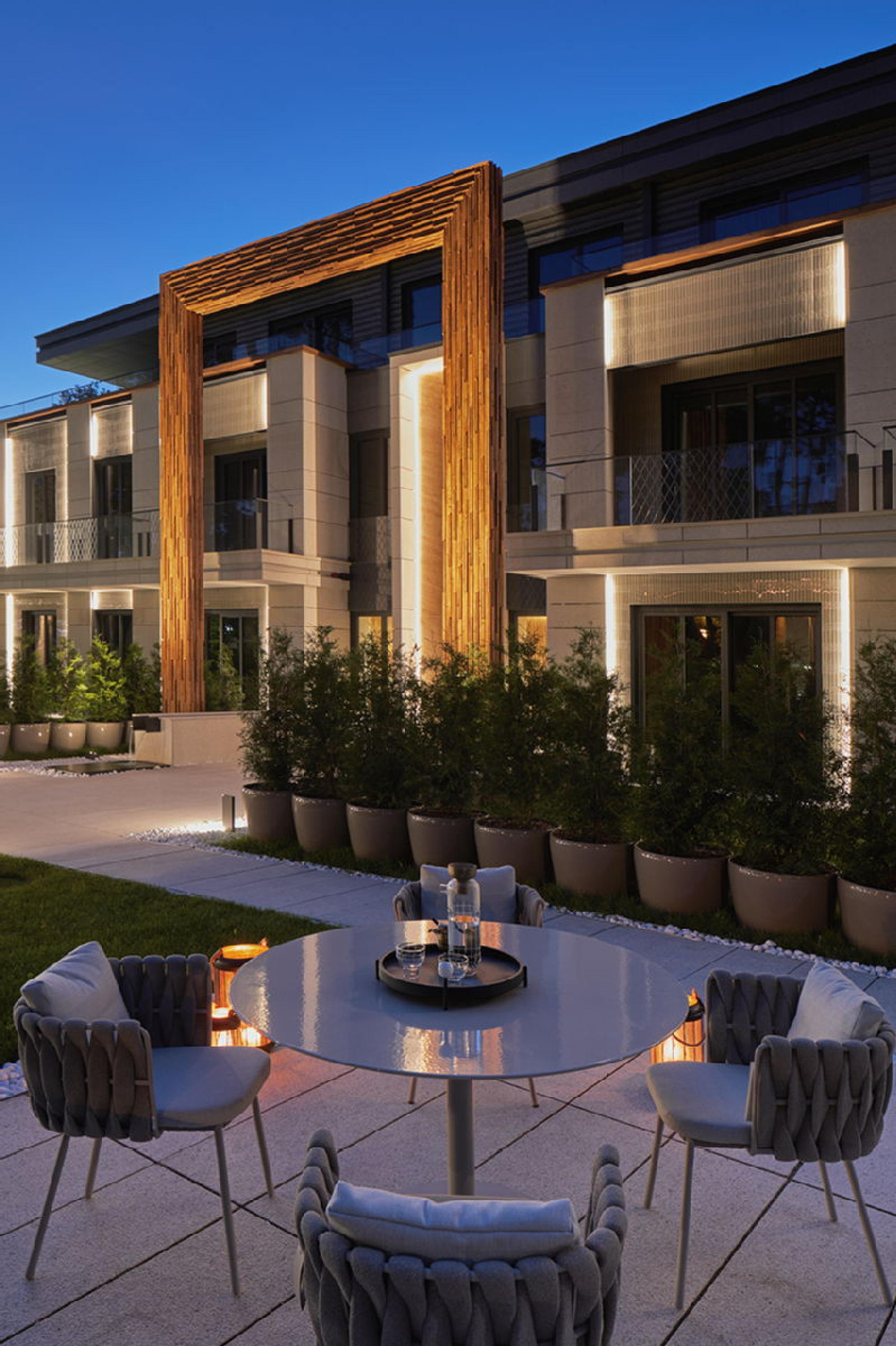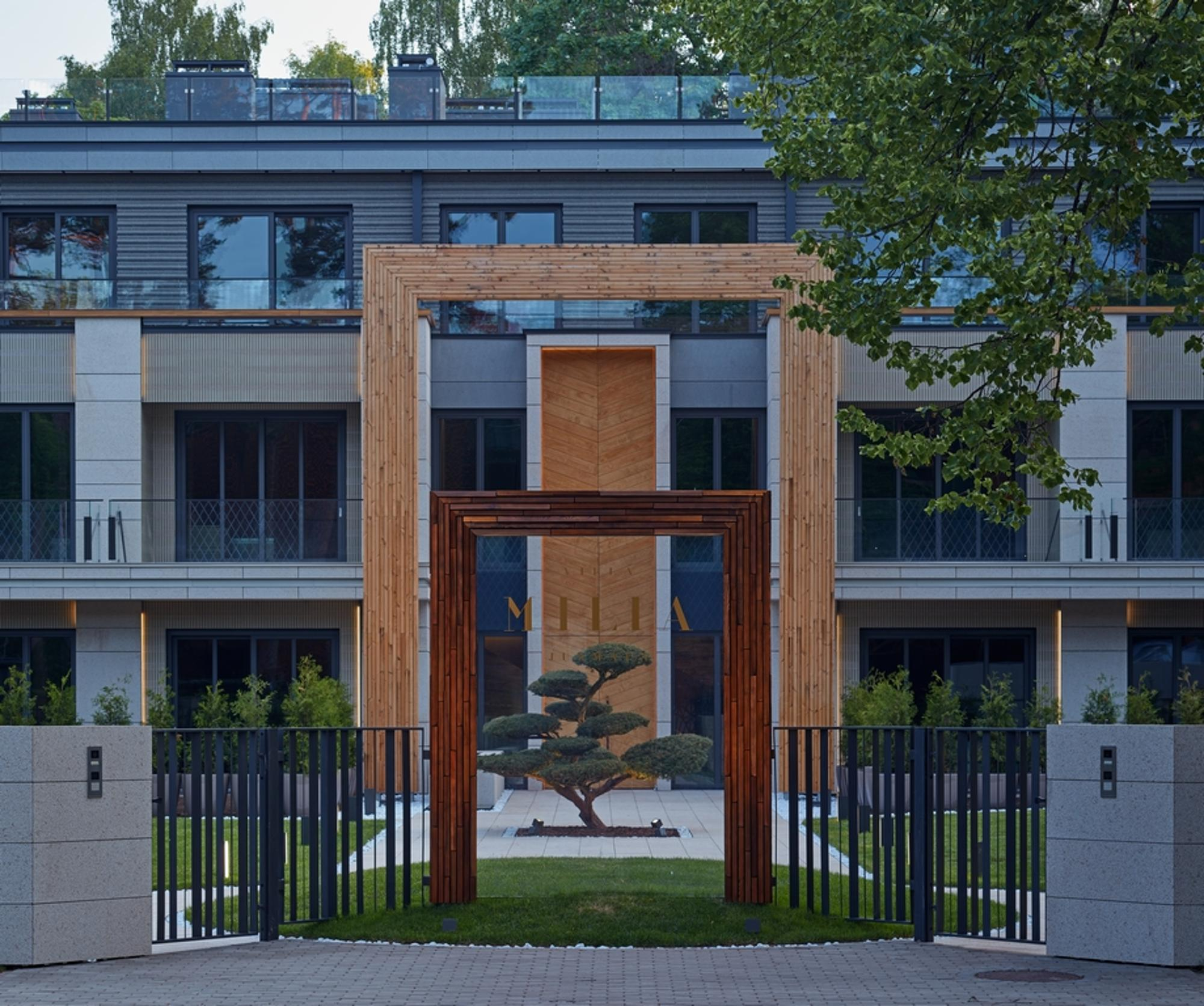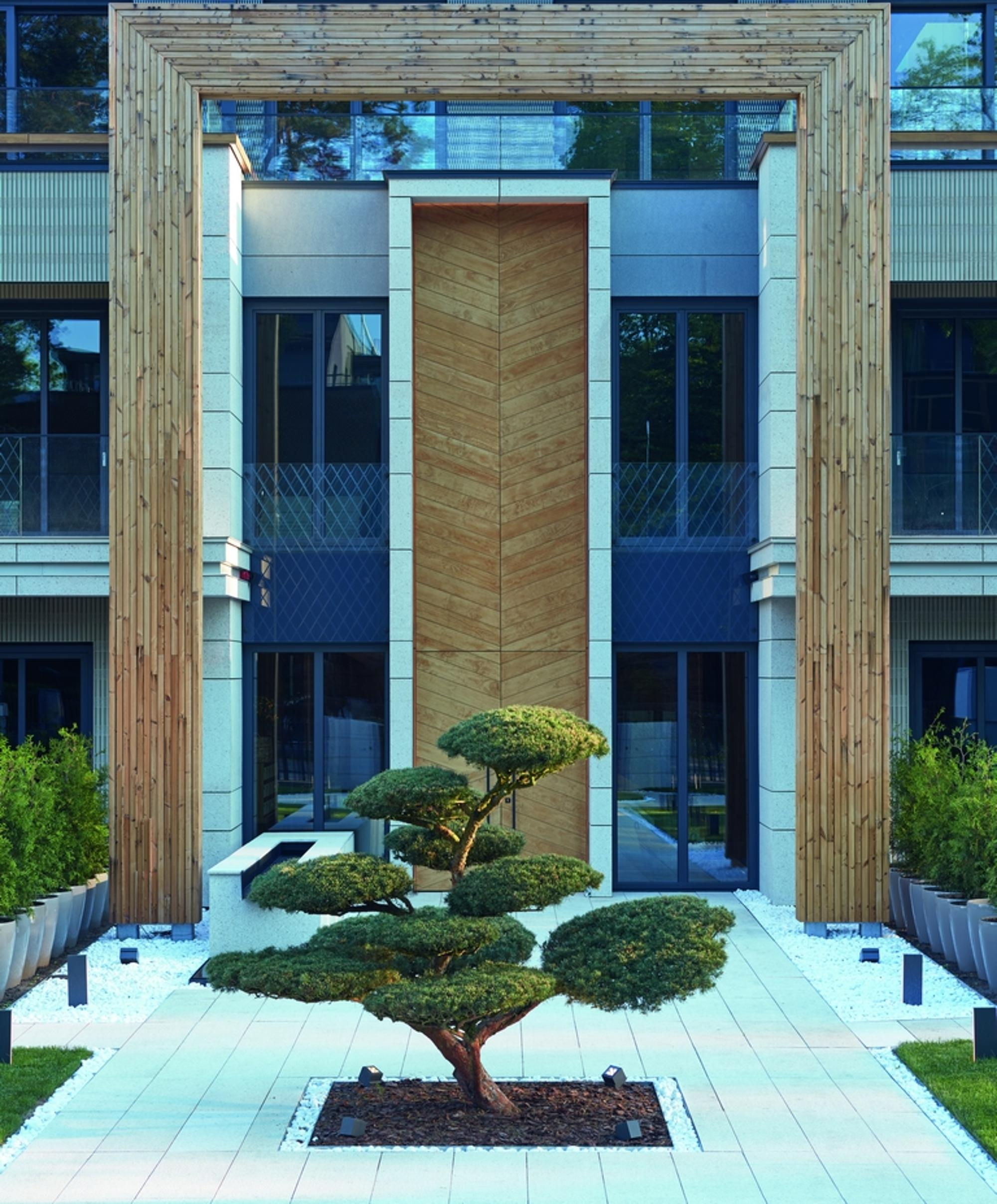 Visas kompozīcijas centrālā ass – vientuļais bonsai koks tieši pretī galvenajai ieejai. Tā eleganci pasvītro dubultā arka, kura gluži kā „laika vārti” apņem ceļu pie nama. Deviņus metrus liels durvju portāls darināts no īpašas termiski apstrādātās Japānas priedes.