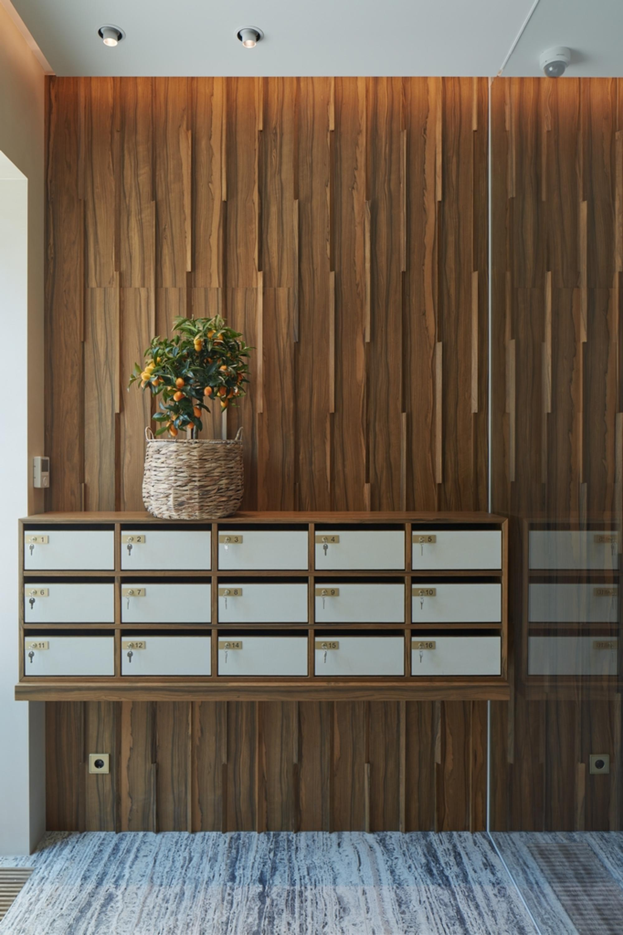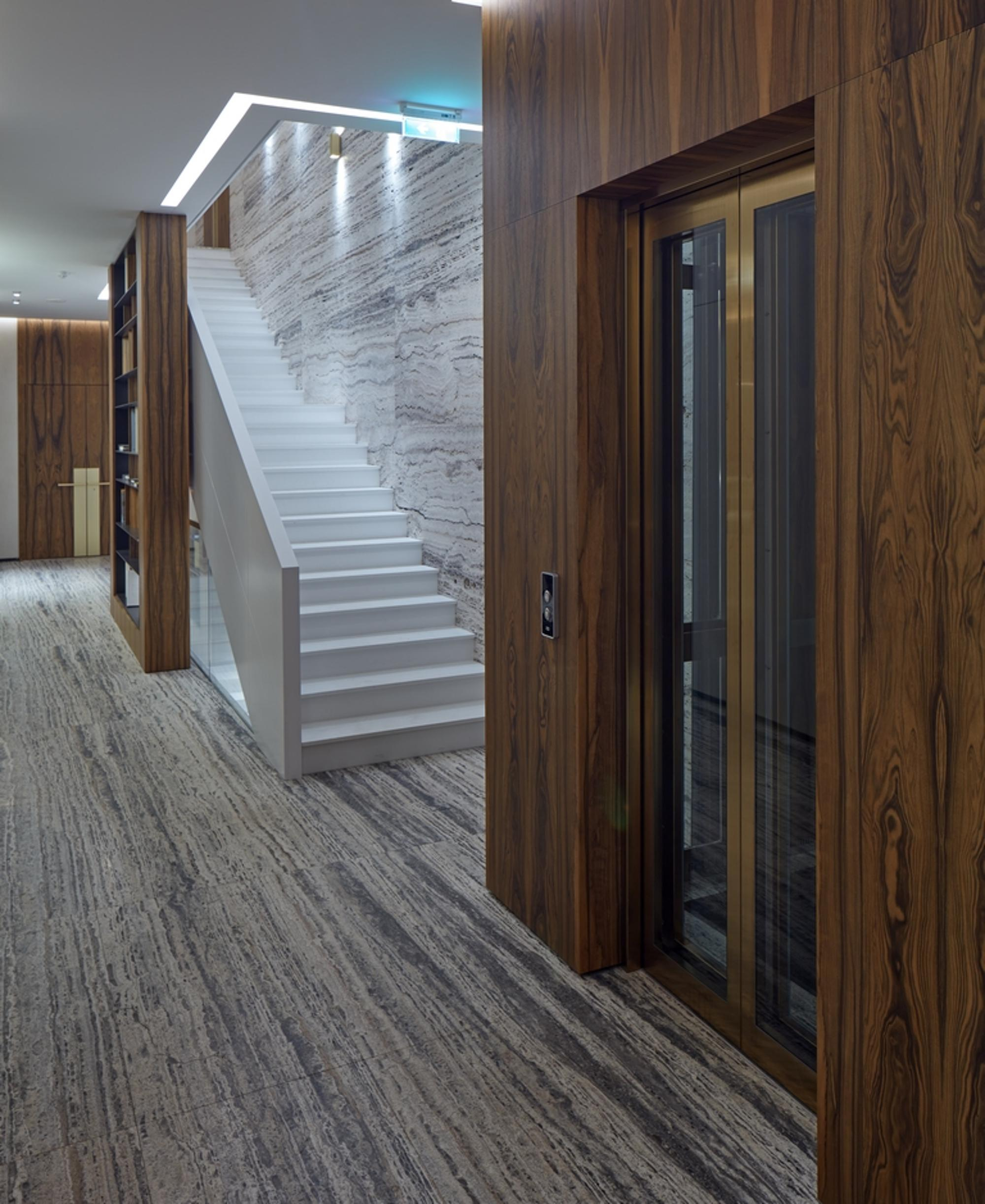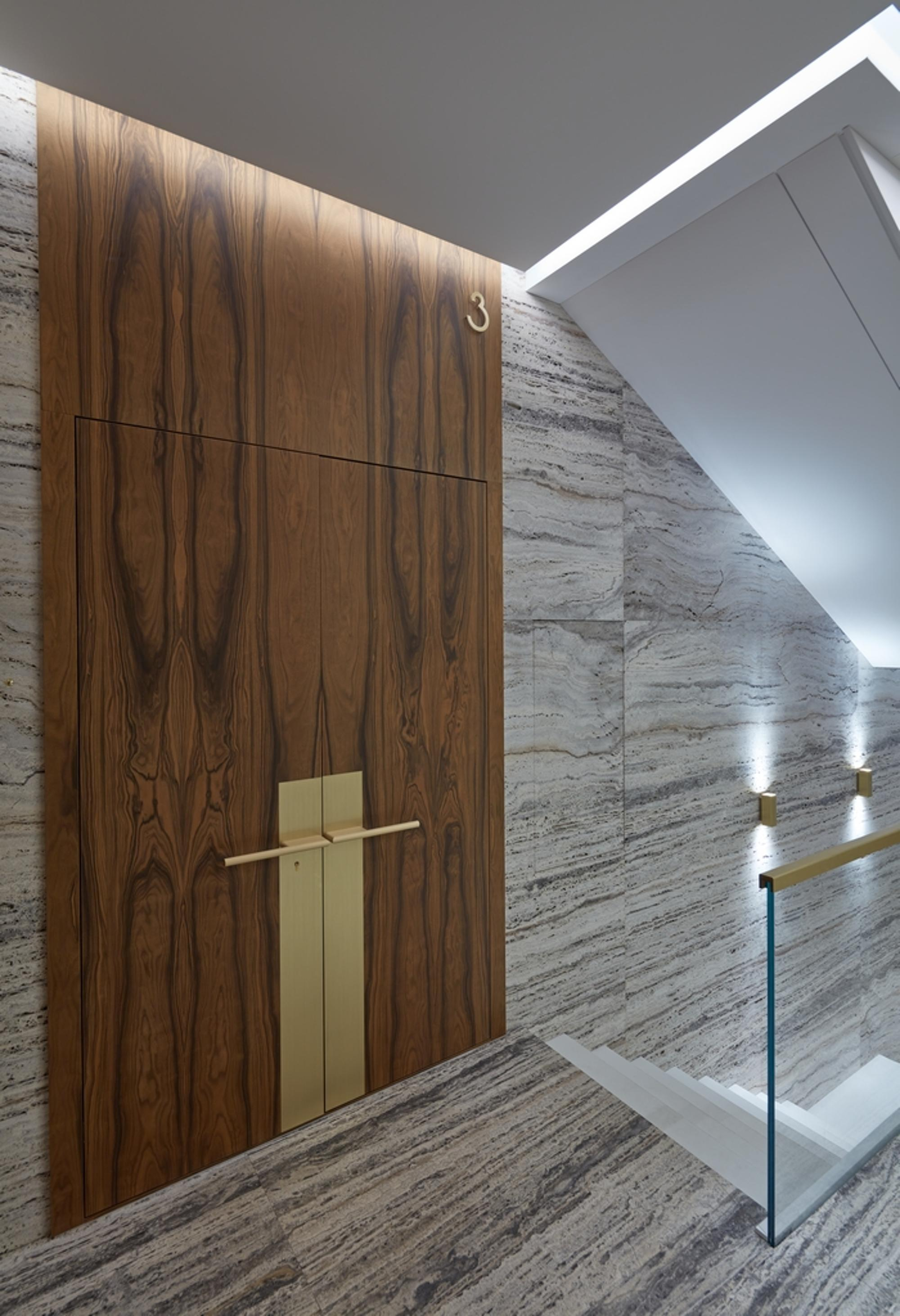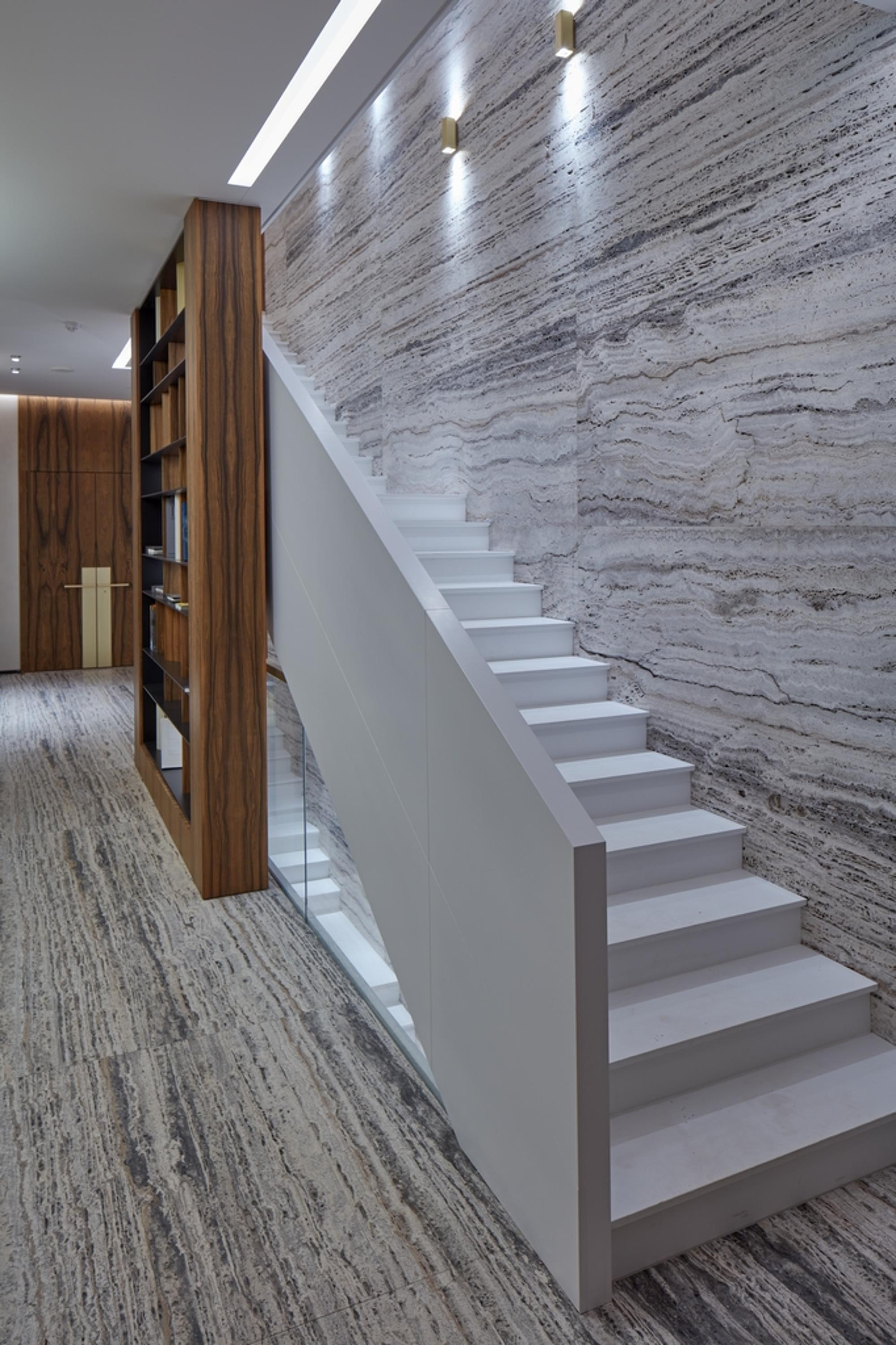 Gaismas avotu daudzveidība, sākot ar efektīgu lustru un līdz pat maigajam sienu un dzīvokļu numuru apgaismojumam padara tajā esošus priekšmetus un detaļās tilpīgas un vizuāli paplašina telpu.