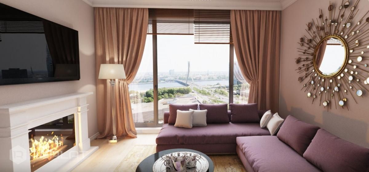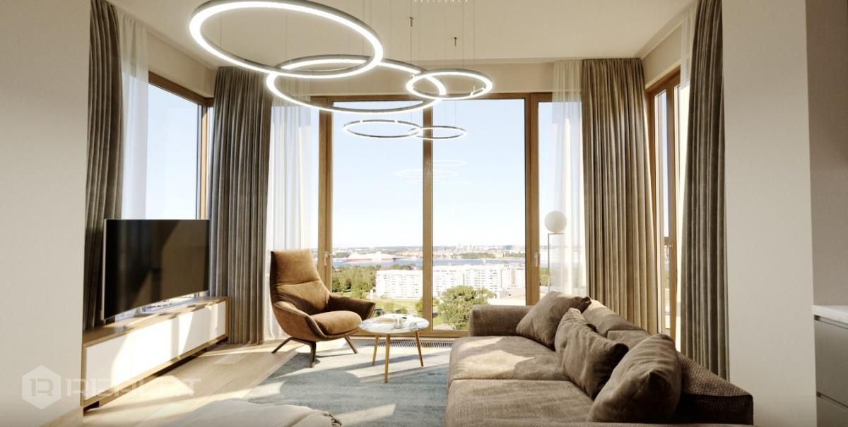 3 līmeņu dzīvoklis ar 7m augstiem griestiem dzīvojamās istabas zonā. Panorāmas skata logi. Pirmajā līmenī pieejama dzīvojamā istaba, kabinets un virtuve, kas atdalīta no viesu uzņemšanas zonas, plaša viesistaba. Otrajā līmenī izvietota guļamistabu zona, katrā dzīvoklī ir Master bedroom. Dzīvokļa trešo līmeni aizņem 100 – 200m² plaša terase, kura ieskauta 3m augstās stikla sienās.