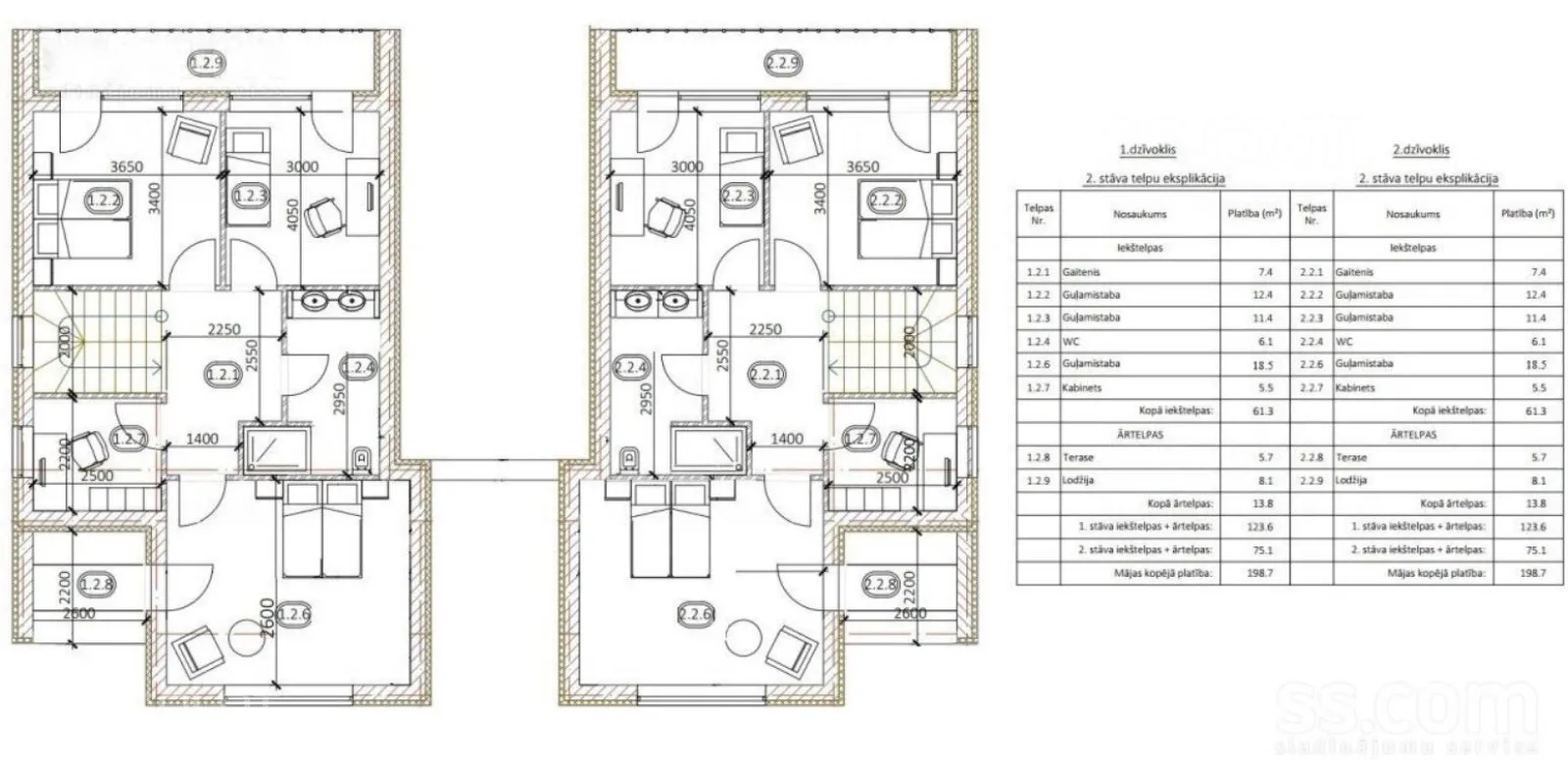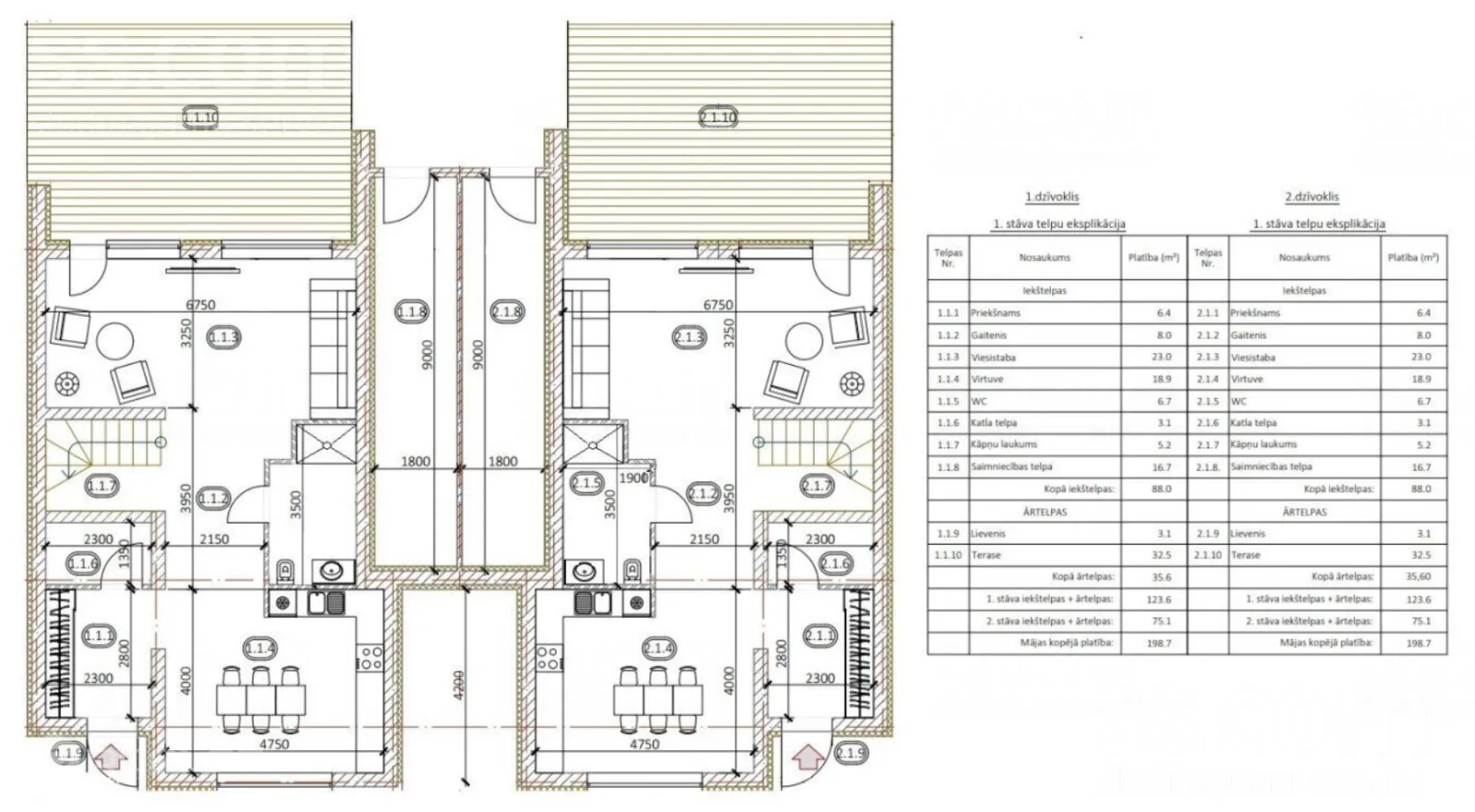 Dzīvojamā platība katrai dvīņu mājas pusei – 135 m².
