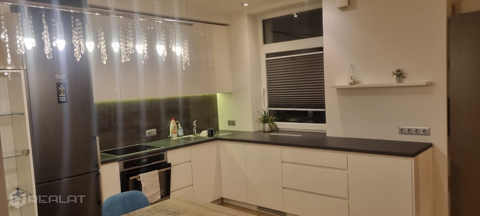 Квартира расположена на восточно-южной стороне здания, что обеспечивает много естественного света и приятный вид на зеленую зону.