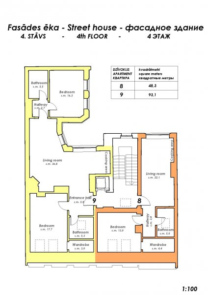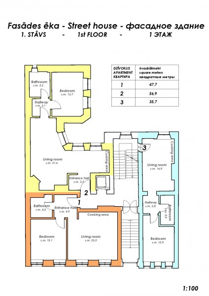 В фасадном здании, выходящем на улицу Дзирнаву находятся 9 квартир различной площади: 35, 7м2 самая маленькая и 101,5м2 самая большая с количеством комнат от 2 до 4.